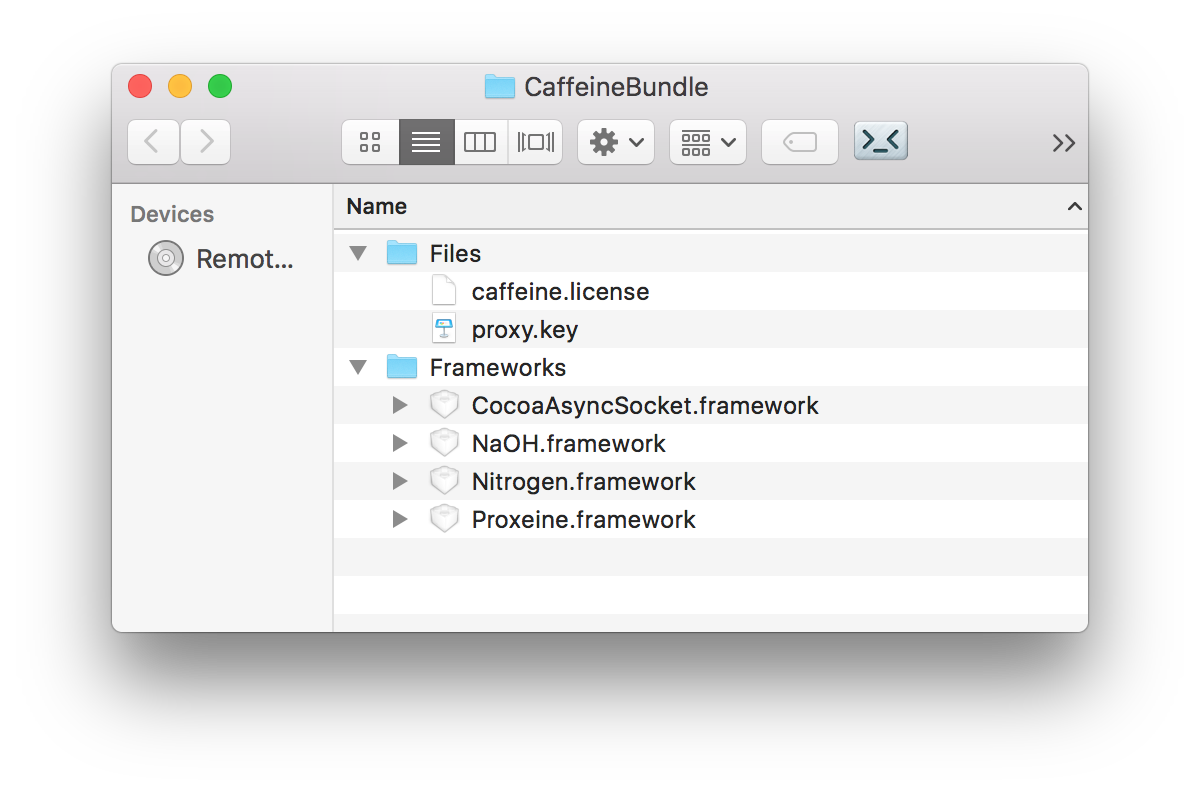 You should now see the two files “caffeine.license” and “proxy.key” within Xcode’s Project Navigator (pictured below)