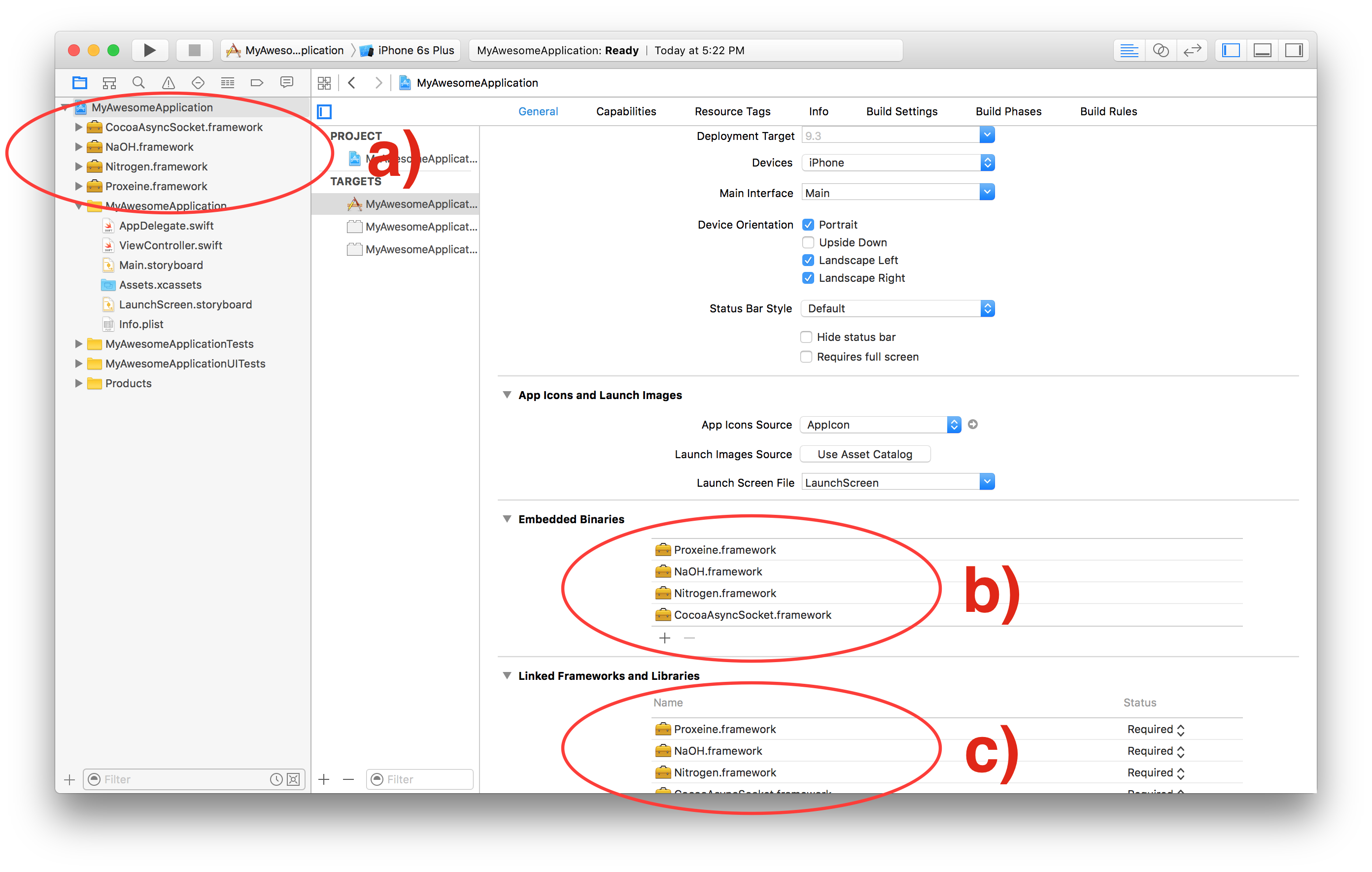 1. Drag and drop the four frameworks into the Embedded Binaries section in Xcode (found on the project’s general tab). In the subsequent prompt, make sure to check “Copy items if needed” before pressing “Finish”.
